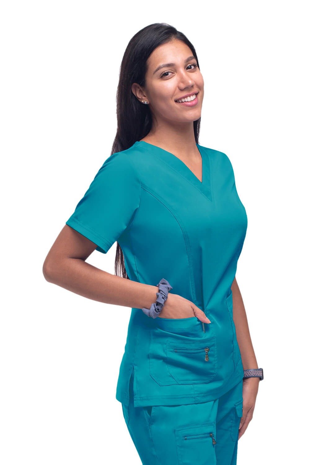 An elevated version of the classic v-neck scrub top. Beautiful details such as a double stitched neckline, back and front curved princess seams, shaped patch pockets and super soft stretch fabric truly make this scrub top a crowd favorite.Iconic Adar zipper detail adorns the front pocket. Features such as double stitching with tonal thread and odor/wrinkle resistant fabric make it just as durable as it is beautiful.