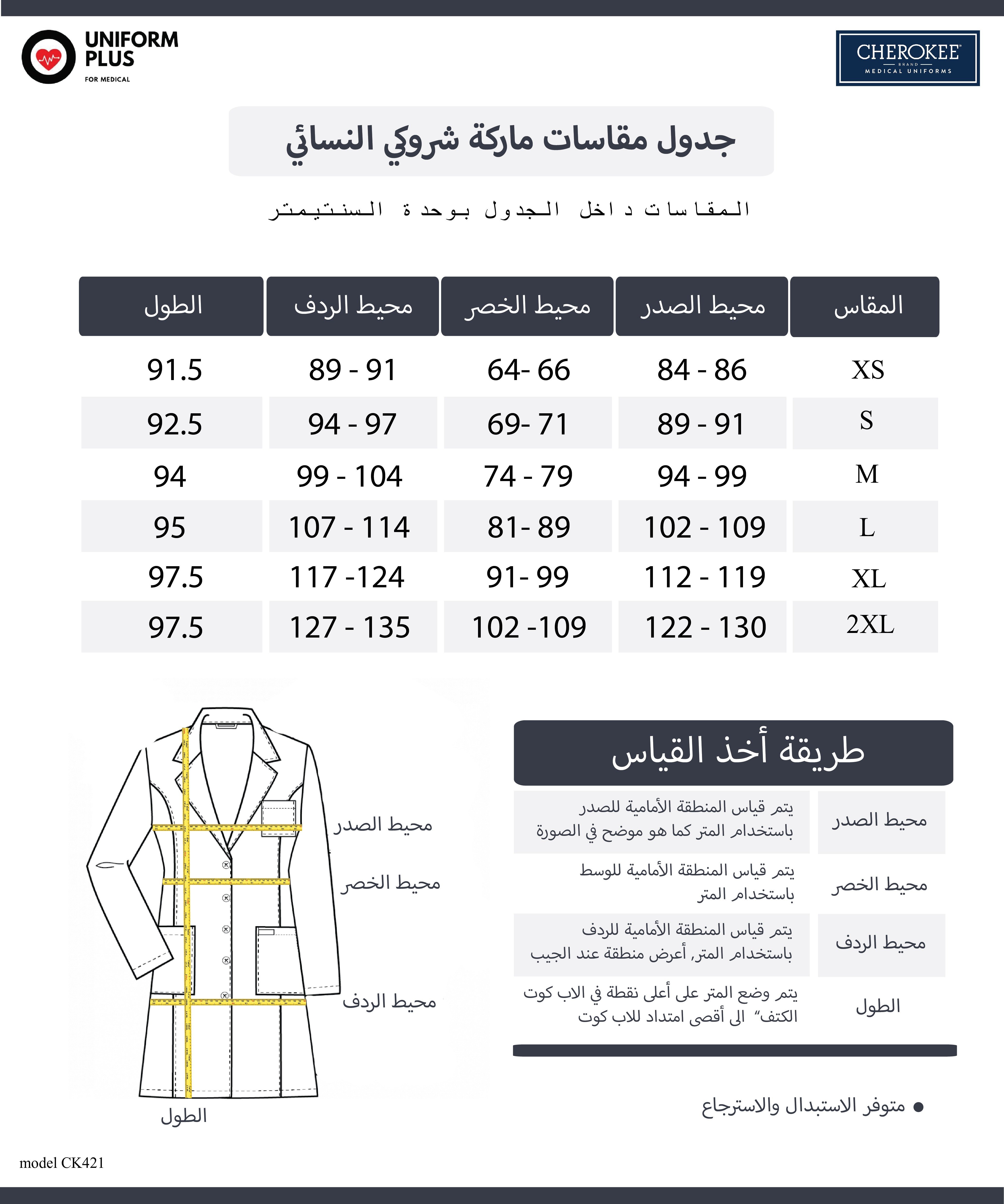 " بالطو طبي من ماركة شروكي الأمريكية المميزه والفريده والذي تم صناعته وفق أعلى مقاييس الجودة للصناعة ، دقة في التصميم وتناسق في الخيوط و روعة في التميز " .