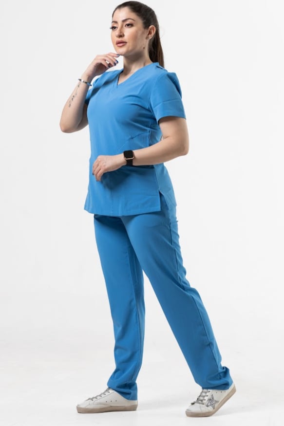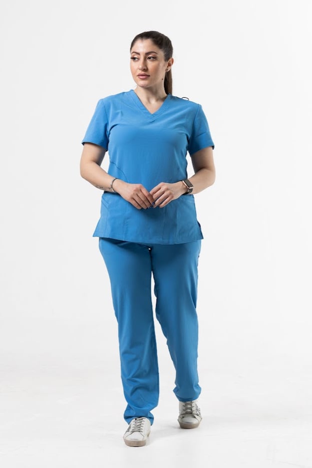 بنسيج مميز وتصميم في غاية الأناقة وفرنا لك طقم سكراب طبي نسائي الجديد والمميز بألوانه المميزة، طقم سكراب عملي بتصميم رياضي وعصري وقماش عملي وناعم، تصميم الياقة علي شكل حرف V ودرزات البلوزة الأمامية المزدوجة في غاية الأناقة والتميزـ يشمل السكراب على مساحات تخزينية تكفي جميع إحتياجاتك، بلوزة سكراب تشمل جيبان أماميان والبنطلون يشمل جيبان أماميان كبيران، تعليقة اداة اعلى الكتف تمكنك من تعليق بطاقة التعريف أو العمل الرسمية، إضافة إلي راحتك خصر البنطلون متوسط الإرتفاع مع حزام قابل للتحكم، القماش ناعم وعملي وسهل العناية مما يجعل هذا السكراب إضافة مميزة لخزانة ملابسك العميلة.