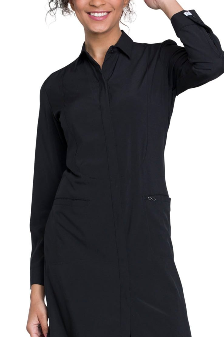 لاب كوت طبي نسائي باللون الأسود من مجموعة انفينتي من ماركة شيروكي يونيفورم، معطف طبي بتصميم أنيق بقصة عصرية، يتميز بقصّة مُفصّلة مع درزات خلفية أنيقة، وفتحة أمامية بأزرار مخفية، وياقة قميص مدببة، وأكمام بأزرار تُطوى بأزرار، اللاب كوت يتميز بجيوب أمامية مُحاكية، وحاشية قصيرة. لابكوت بتصميم طويل يلائم احتياجاتك وراحتك أثناء العمل.