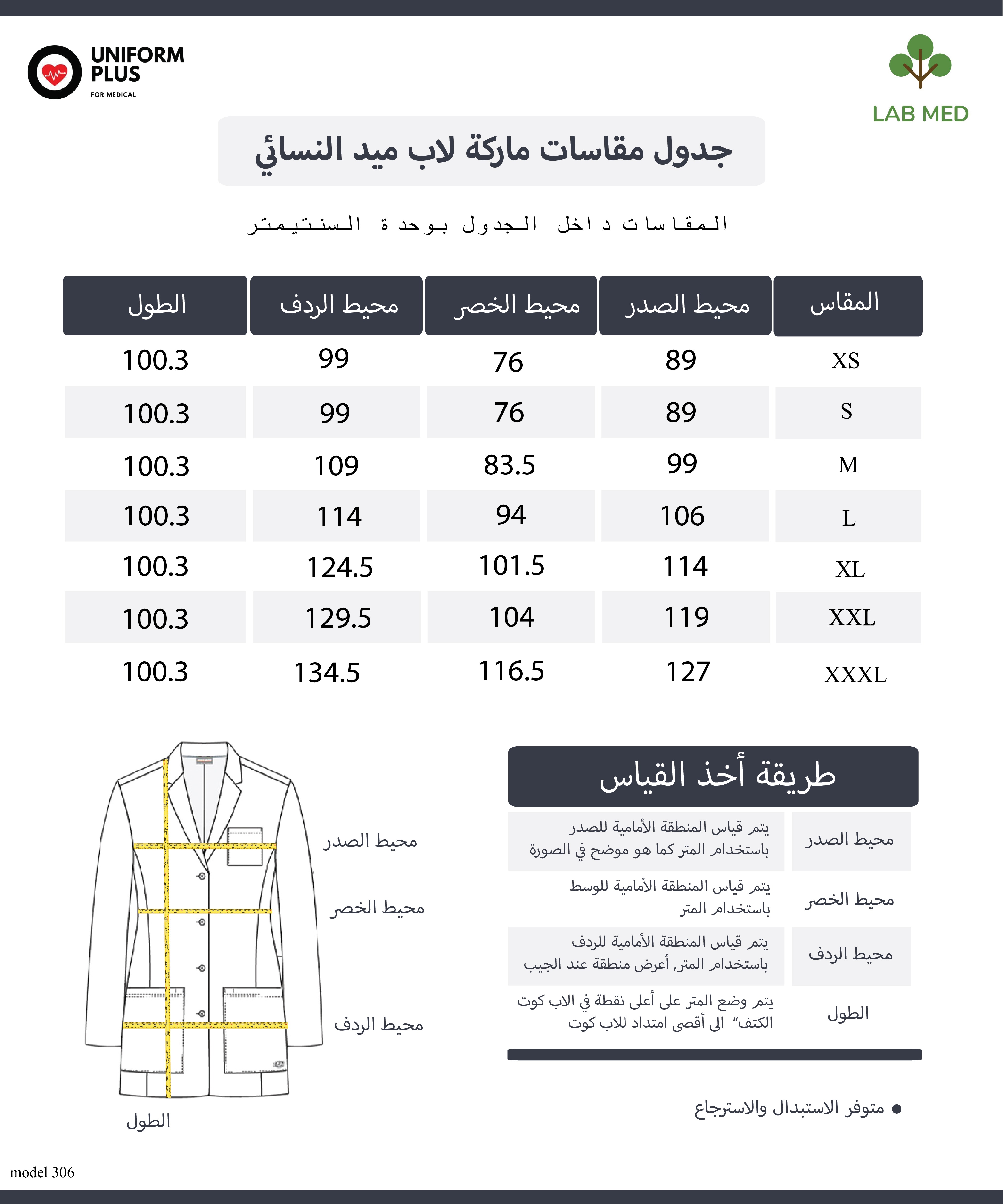 عملنا على تصميم وتوفير لاب كوت طبي لابد ميد ذات بطول 40 انش ، تمت حياكته من افضل أنواع الخيوط والاقمشة .
