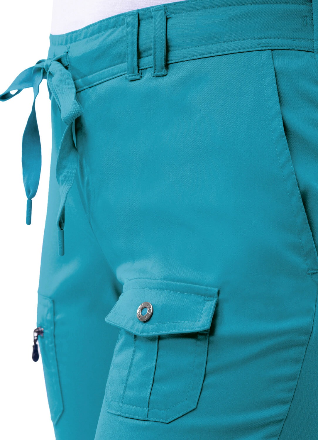 6 pockets: 2 deep front slash pockets, 1 front zippered pocket on right upper leg, 1 front snap button pocket on left upper leg, 2 back snap button pockets