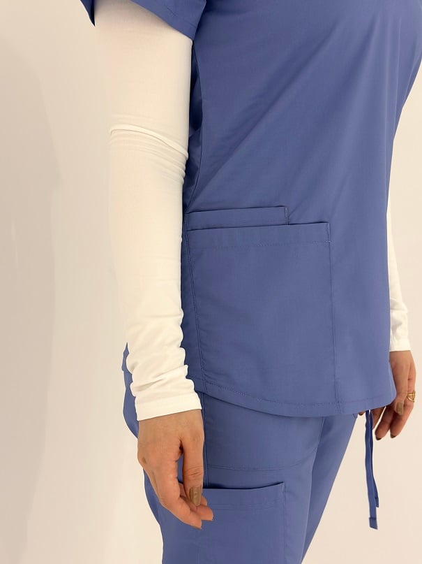 بلوزة سكراب طبي نسائي الجديدة متوفرة من ماركة لاب ميد LAB MED الان بعدة ألوان وطول مناسب، قصة عصرية وتصميم عملي بسيط، توب سكراب النسائي يتميز بجيبين أمامين لتخزين إحتياجاتك، أكمام قصيرة مع تصميم ياقة السكراب على شكل حرف V ، كل هذا بالإضافة إلي قماش عملي ناعم وبارد مع فتحات تهوية ليوم عمل مثالي.
