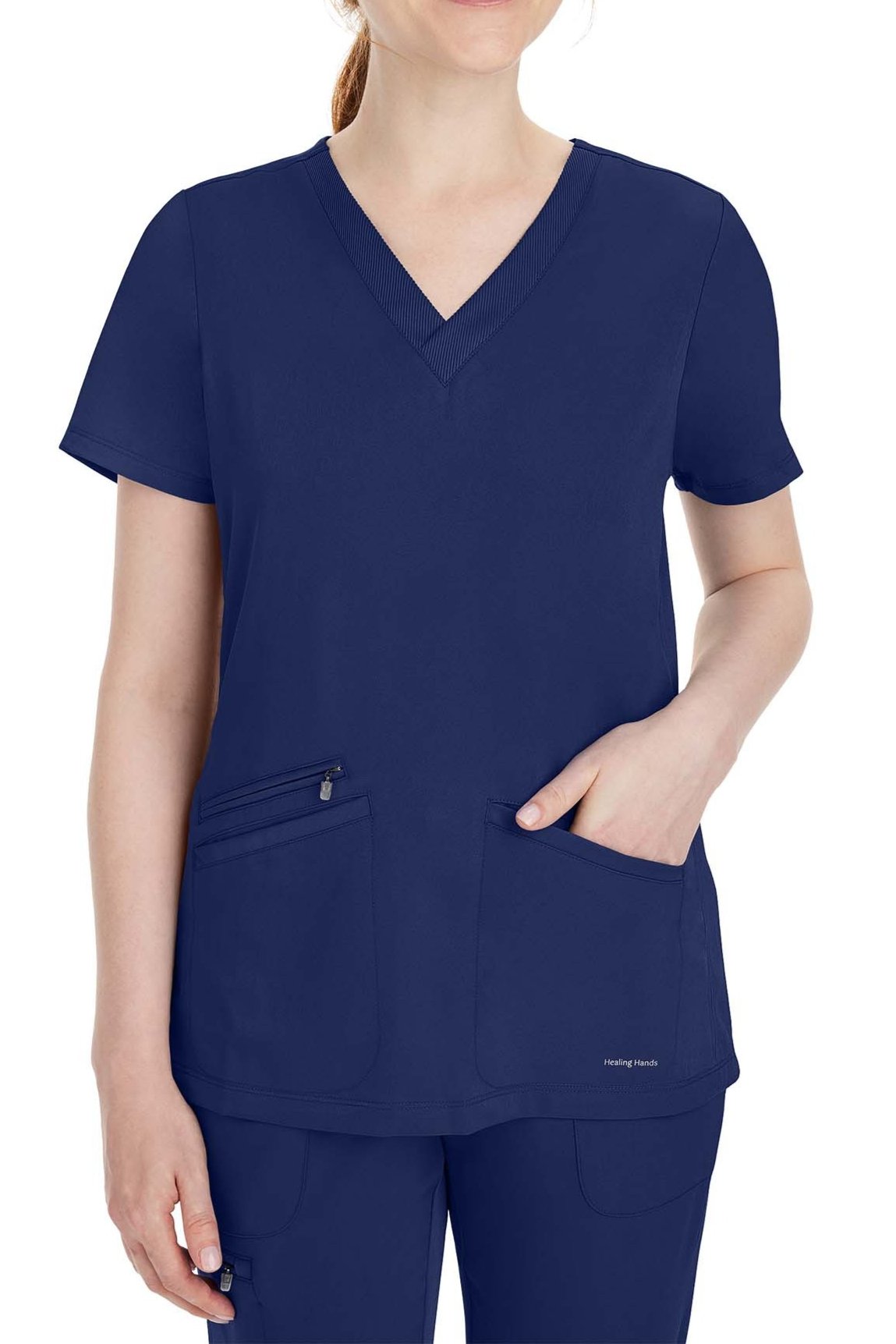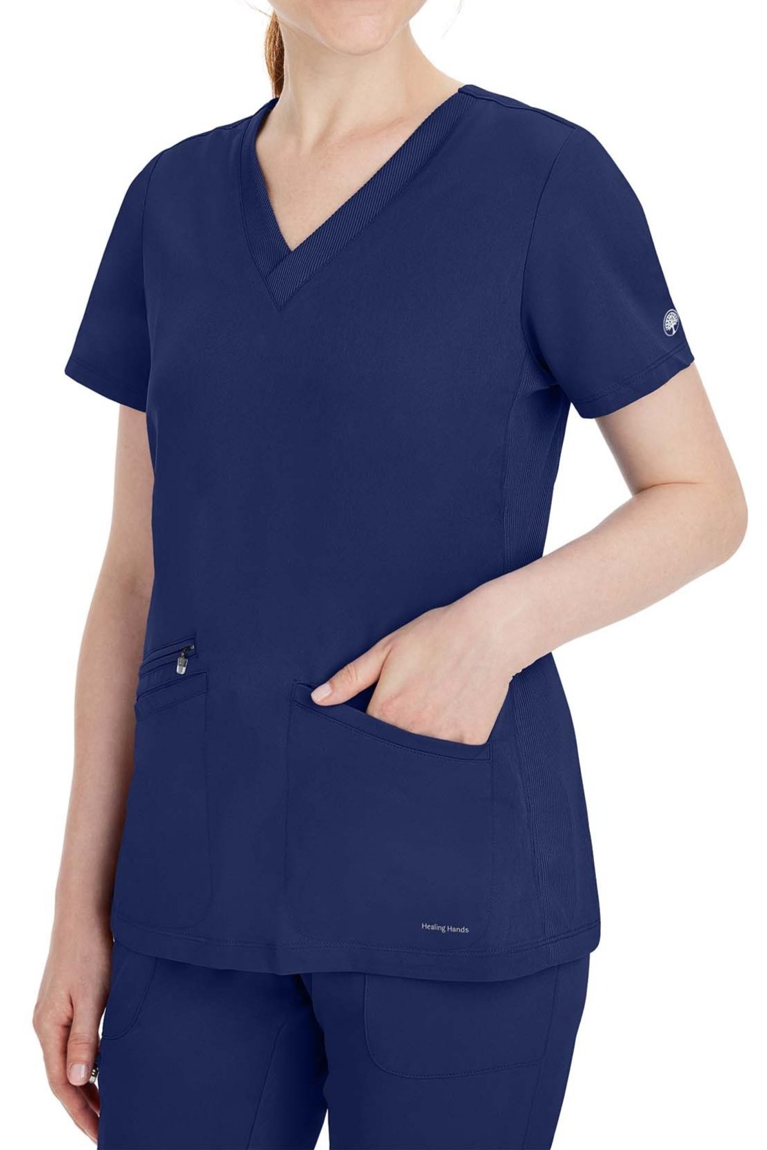 في مظهر جديد ورياضي وفرنا لك بلوزة سكراب طبي ماركة هيلينج هاندز Healing Hands من مجموعة HH WORK التي تجمع بين التمدد والأناقة والأداء العملي المزدوج. بتصميم خاص وجديد من نوعة في بلوزة سكراب نسائية بجوانب مرنة وقماش في غاية الراحة وفائق النعومة. ياقة على شكل حرف V ومساحات تخزينية أمامية تكفي جميع إحتياجاتك مع جيب تخزيني بسحاب لجوالك وأغراضك المهمة. شعار ماركة هيلينج هاندز أعلى الكتف مع فتحات جانبية لحركة وأداء غير محدود ومرونة فائقة لقماش ناعم متمدد مقاوم للإنكماش والتجعد وسهل العناية.