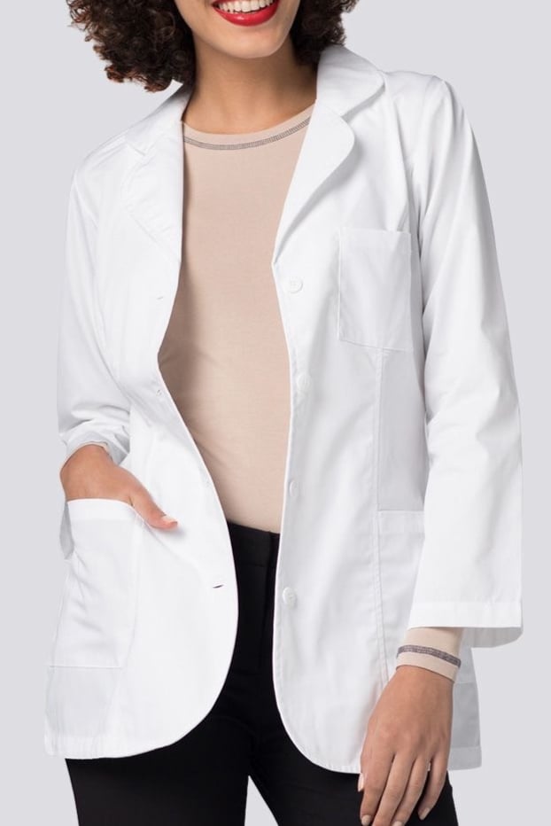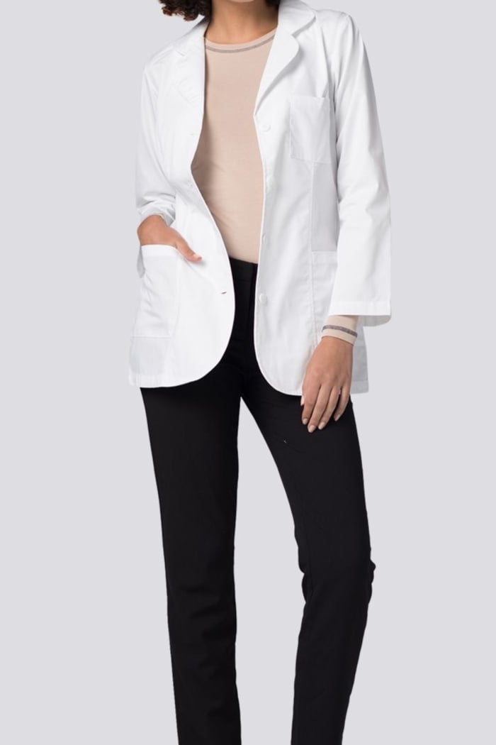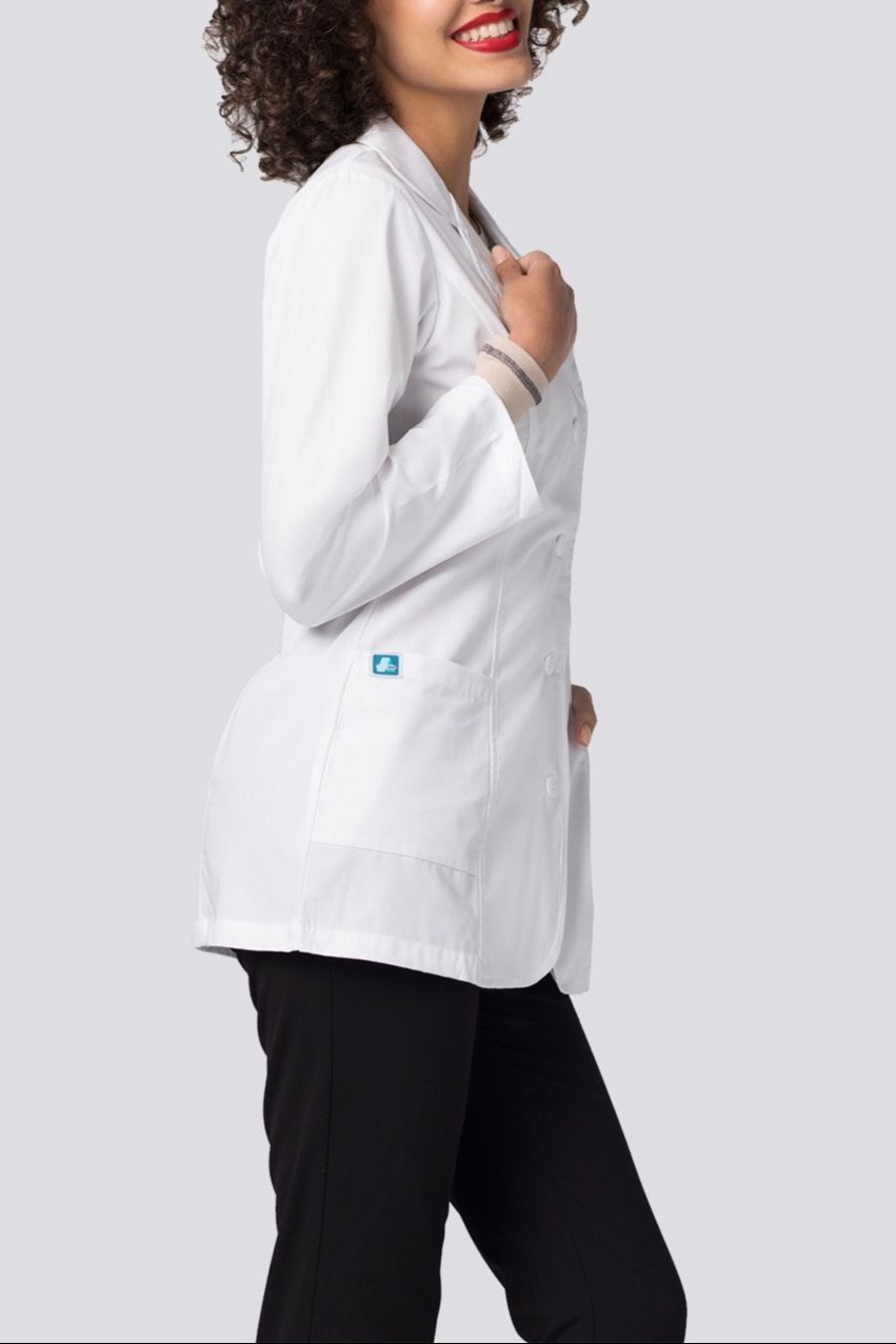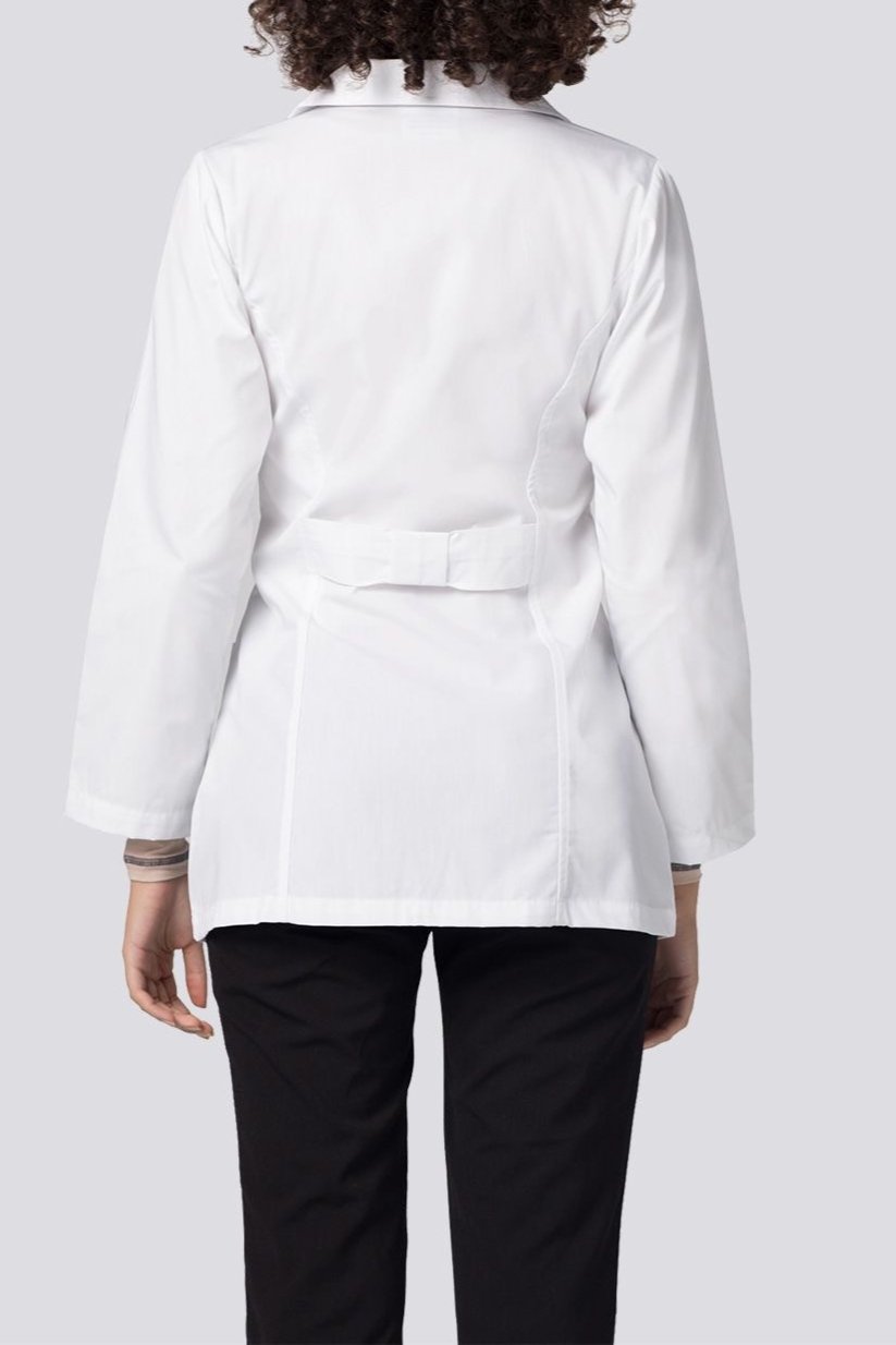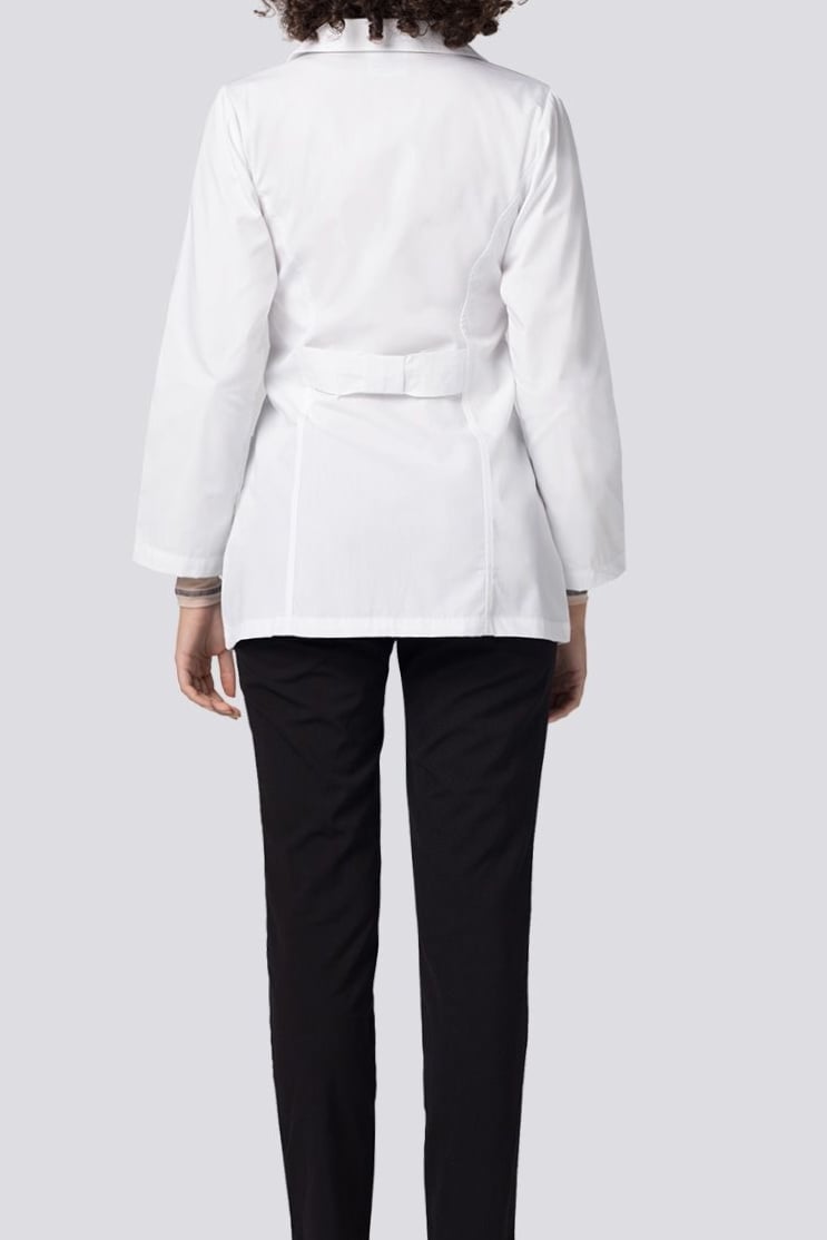 • The lab coat has a fixed back belt and curved front edges that add a feminine touch.