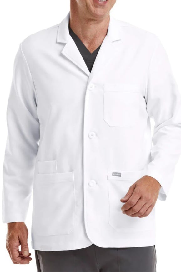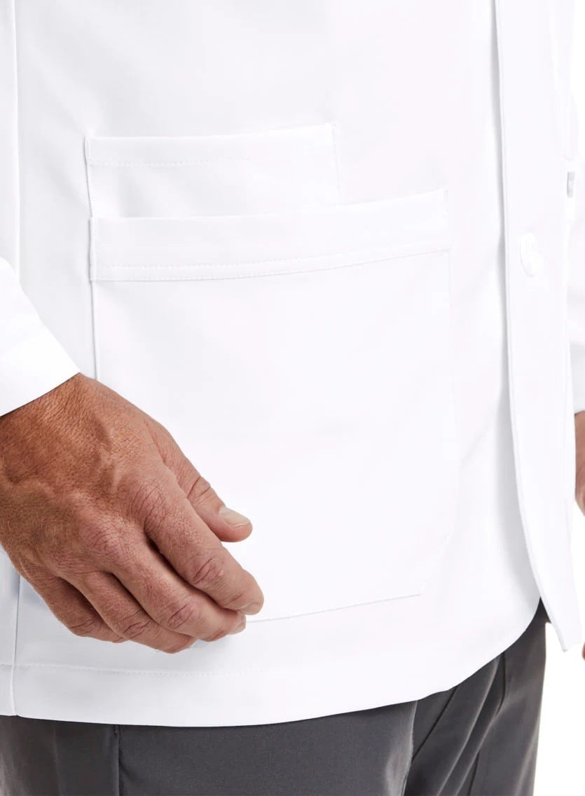Men's medical lab coat from the Maevn brand, from the Maevn Momentum Men's collection, with a modern cut and a suitable length of 30 inches. Classic lapel design with three-button front closure. The men's lapel collar includes several practical pockets to store all your needs, along with a durable, flexible practical pocket with a waterproof feature.