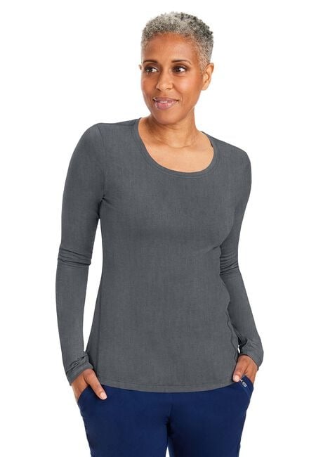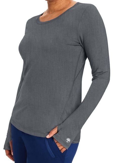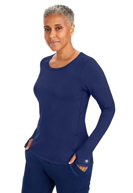 The medical Mackenzie t-shirt from Healing Hands purple label collection, specialized in medical scrubs and medical outfits. the scrub shirt is perfectly suited for your work. It is essentially your new favorite starting point with long sleeves that you can also wear under the scrub top part of your medical scrub Uniform. Choose the suitable color for your work. The luxurious fabric provides a more sporty look and feel, making you comfortable throughout the day. The modern design with maximum durability, the top 5051 Mackenzie with long sleeves medical scrub t-shirt created for professional and healthcare workers, top scrub is made of high-quality fabric characterized by an elegant round neckline, a high-low hem, and thumbholes.